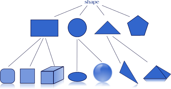 The class hierarchy above shows how the very general shape object is classified at every stage by other different shapes. The more we go down from the top, the more we specify the object. If we take the path of the rectangle, it is divided into three specific objects - rounded rectangle, square and a cuboid.